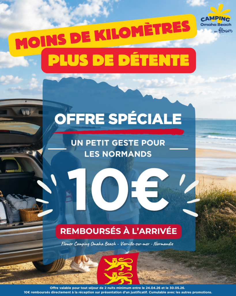 Du 24 avril au 30 mai 2026, si vous habitez en Normandie, profitez d’une offre exclusive au Camping Omaha Beach à Vierville-sur-Mer ! Pour tout séjour de 2 nuits minimum, nous vous remboursons 10€ à votre arrivée pour une escapade ressourçante près de chez vous, face à la mer.